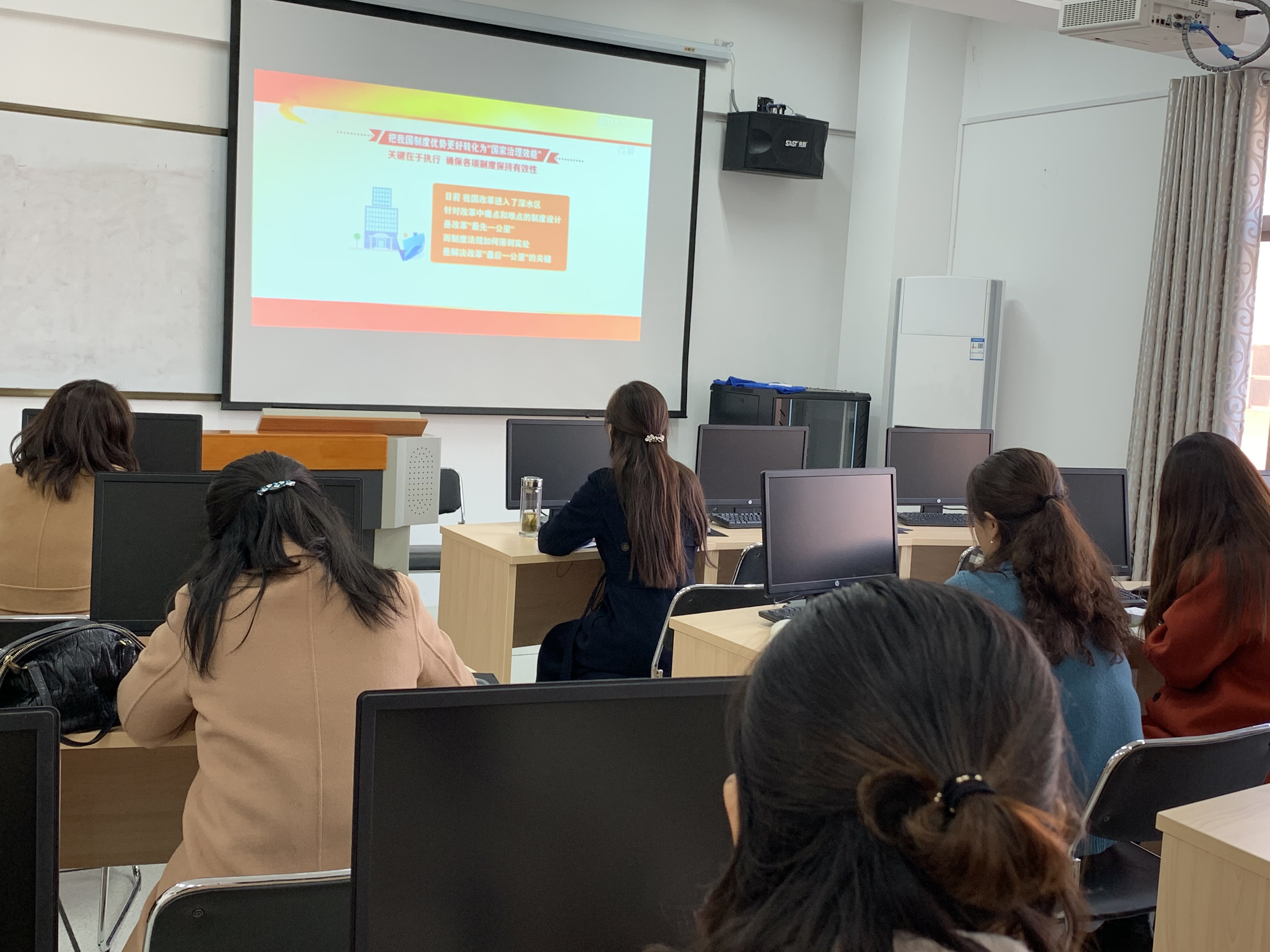 11月20日下午,素质教育中心党支部集中观看了《中国共产党十九届四中全会新闻发布会》,学习了《第十九届四中全会会议精神解读》。素质教育中心支部的党员教师们表示,一定要把总书记重要讲话精神和十九届四中全会精神学习好、领会好、贯彻好,要做到坚持学思践悟、学通弄懂、学以致用,真正用先进思想武装头脑、指导实践、推动工作,把会议精神切切实实转化为推动高质量发展的强大动力。