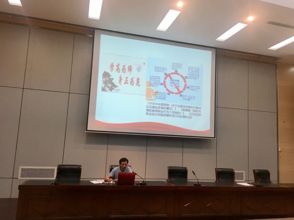 会议分两阶段进行。第一阶段,马万顺院长对本学期全体教师在疫情期间,能迅速学习和使用各种线上平台进行线上授课给予了肯定和表扬,强调了本学期期末教学材料的整理和归档要求,并对暑期师资培训工作的开展做了统筹安排和部署。第二阶段,高大响副书记带领教职工学习了《江苏农林职业技术学院教师师德失范行为处理办法》,并讲解相关的警示案例,为教职工们进行了一场师德教育;陈立娥副院长为简单讲解了2020年《政府工作报告》,为教职工们上了一堂“思政课”。