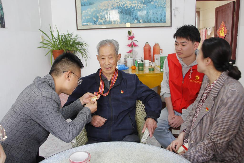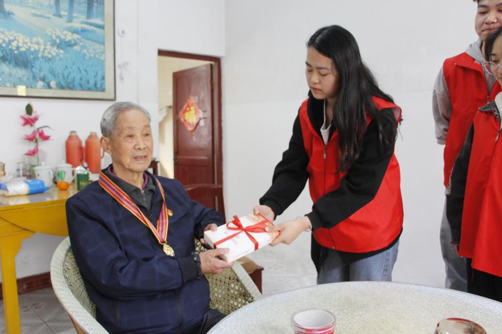 陶顺楠爷爷向同学讲述了自己三次入朝的亲身经历,并为学生展示了珍藏的抗美援朝纪念勋章。陶顺楠同志还为社团成员赠送了党史书籍,叮嘱社团学生多读党史,学好本领,为国家和人民多做贡献。
