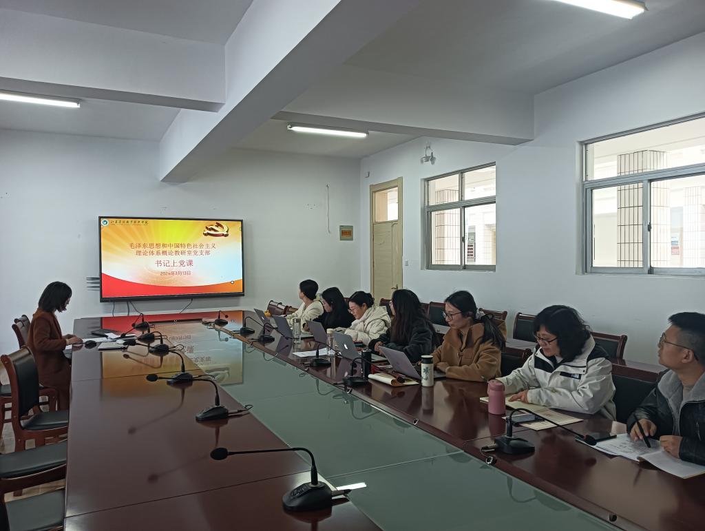 3月13日下午,概论教研室党支部书记王晓庆同志在创客空间314为支部全体党员上了一堂关于“2024全国两会精神理论学习——加快发展新质生产力”的主题党课。
